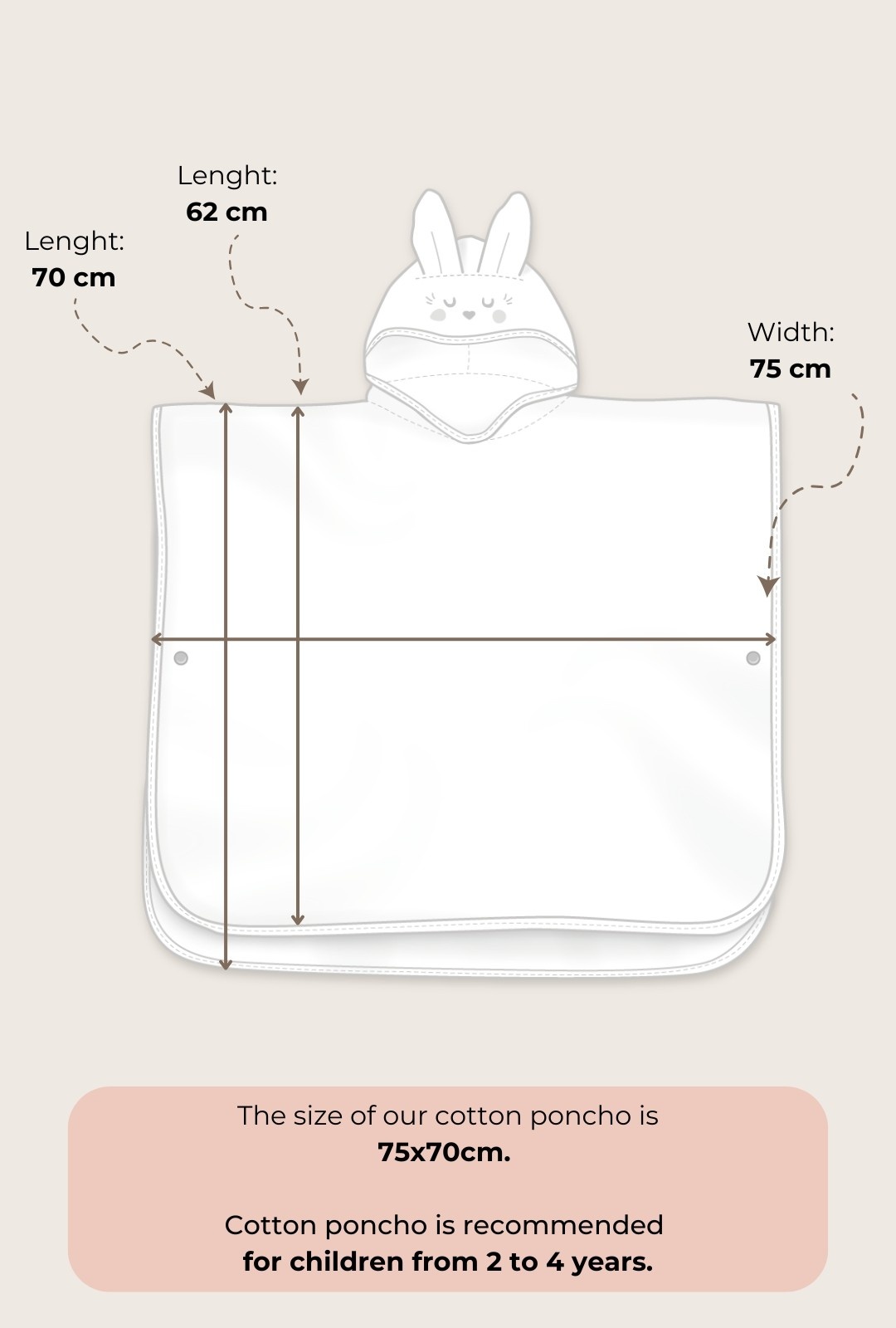 Made of soft Egyptian cotton, with adorable embroidery of a cat, mouse or bunny on the hood and a thoughtful cut – we sewed it with moms and their busy toddlers in mind. Longer in the back so that it covers the back even when the baby sits up. With napkins on the sides to create comfortable sleeves – so the poncho works not only as a towel, but also as a beach outfit for digging in the sand, running around the house or relaxing on the deck chair at grandparents’.