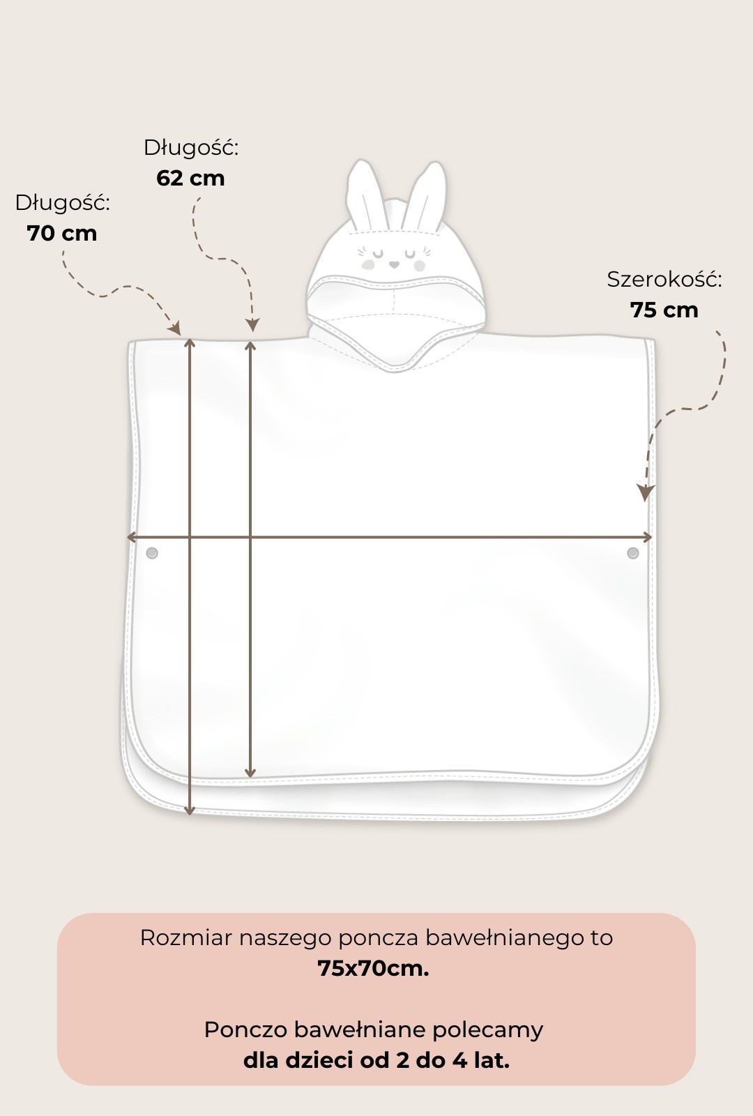 We know how quickly children grow in the first years of life, which is why our children’s bath ponchos are available in two sizes: for toddlers aged 1-3 years and for slightly older children aged 2-4 years. Thanks to this, the bath poncho does not restrict movement, allowing your little one to joyfully explore the world without any restrictions. Its loose fit is a guarantee of comfort during daily care, and you can be sure that your child is wrapped in warmth and softness.