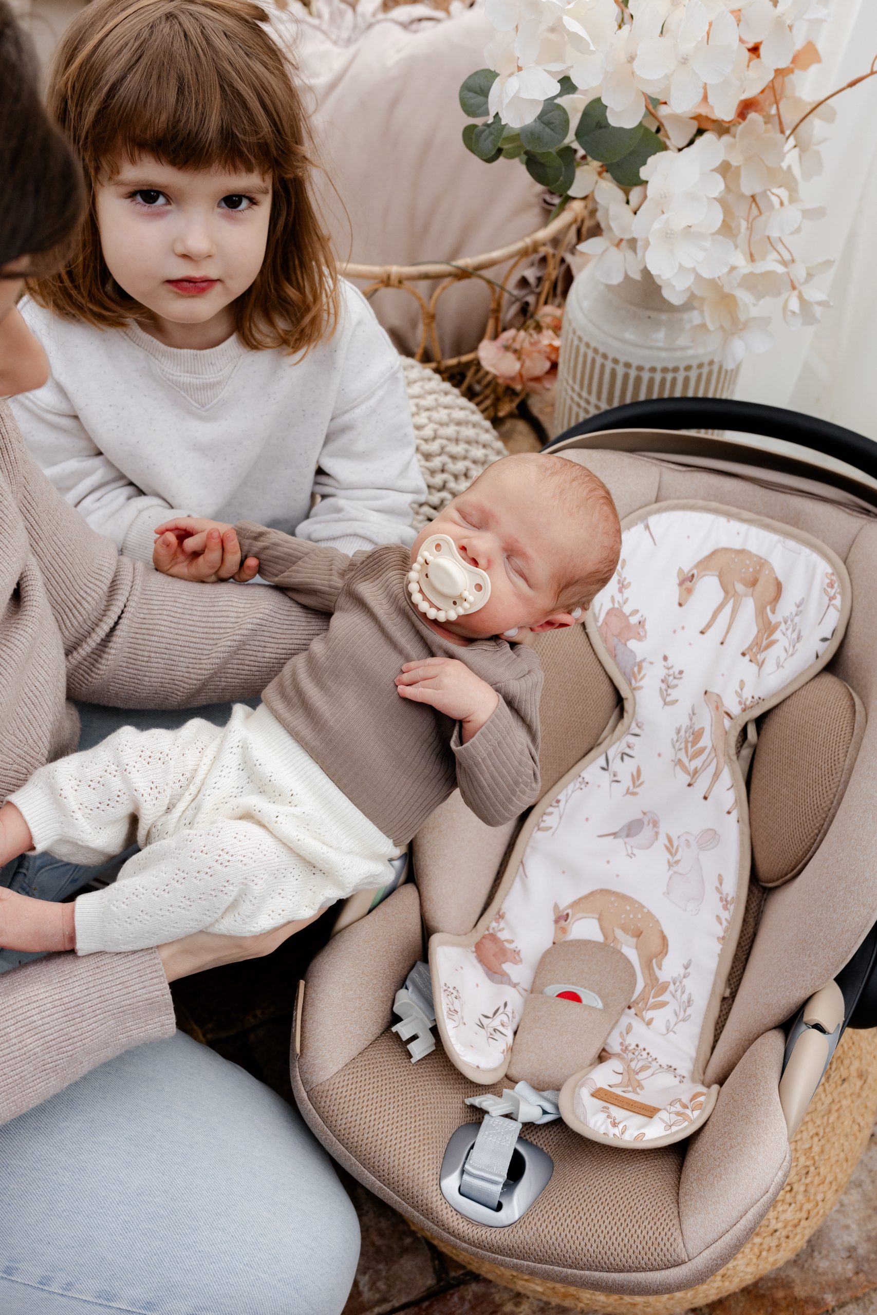 Wkładka została zaprojektowana tak, aby zapewniać komfort, nie zaburzając funkcji ochronnych fotelika. Nie zmienia sposobu działania pasów ani ich ułożenia – działa razem z fotelikiem, nie zamiast niego.