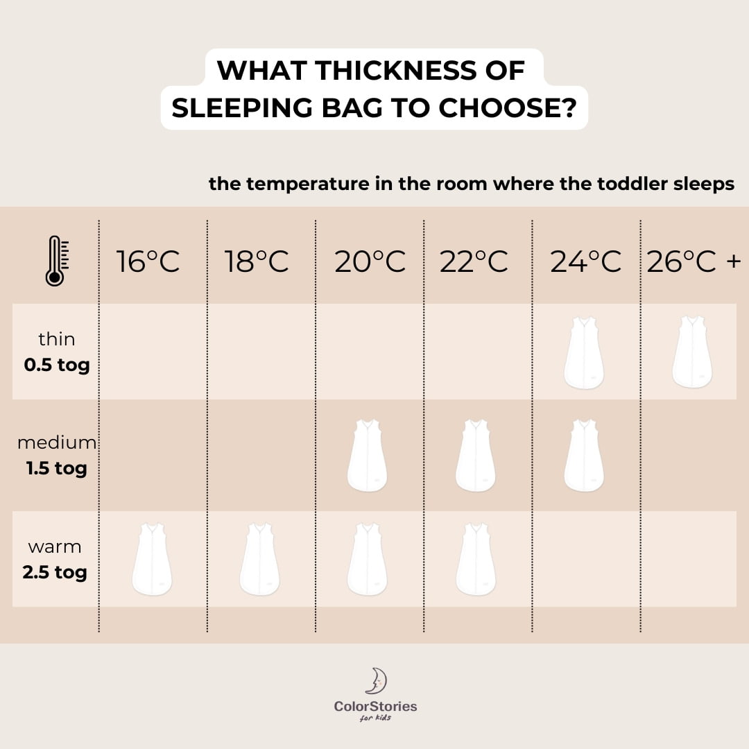 The TOG scale is a measure that determines how well a material or product insulates heat. The higher the TOG value, the more warmth it provides. For example, if you see that a sleeping bag or blanket has a high TOG value, it means that it will keep you more warm and perform well during winter evenings. Remember that the TOG scale of the sleeping bag is selected according to the temperature in the room where the toddler sleeps, not the weather and the temperature outside.