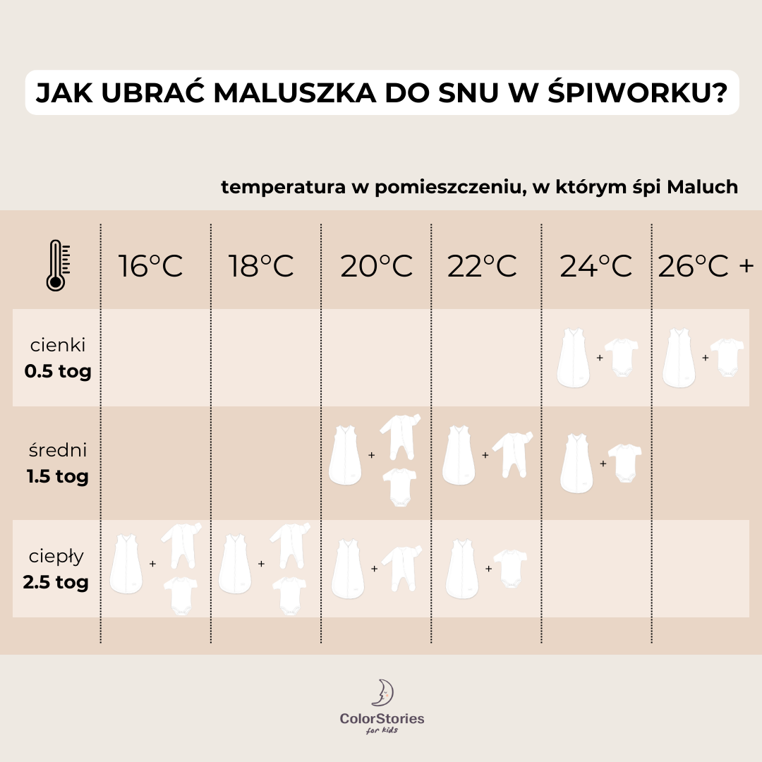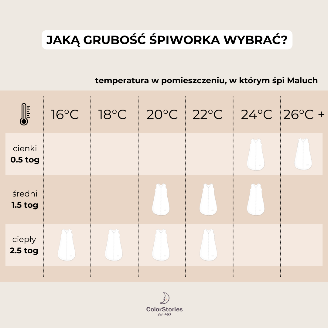 Wybór odpowiedniego śpiworka zależy od temperatury w pokoju, w którym śpi Twoje dziecko. Oto jak dobrać śpiworek ColorStories do różnych temperatur: