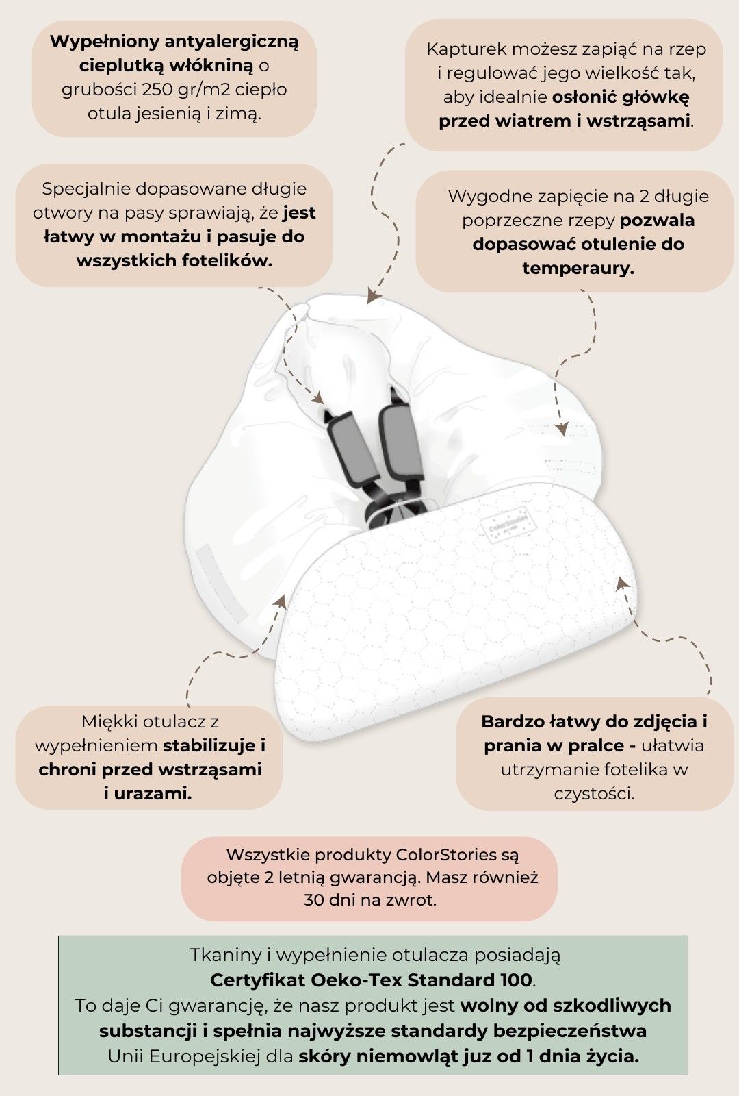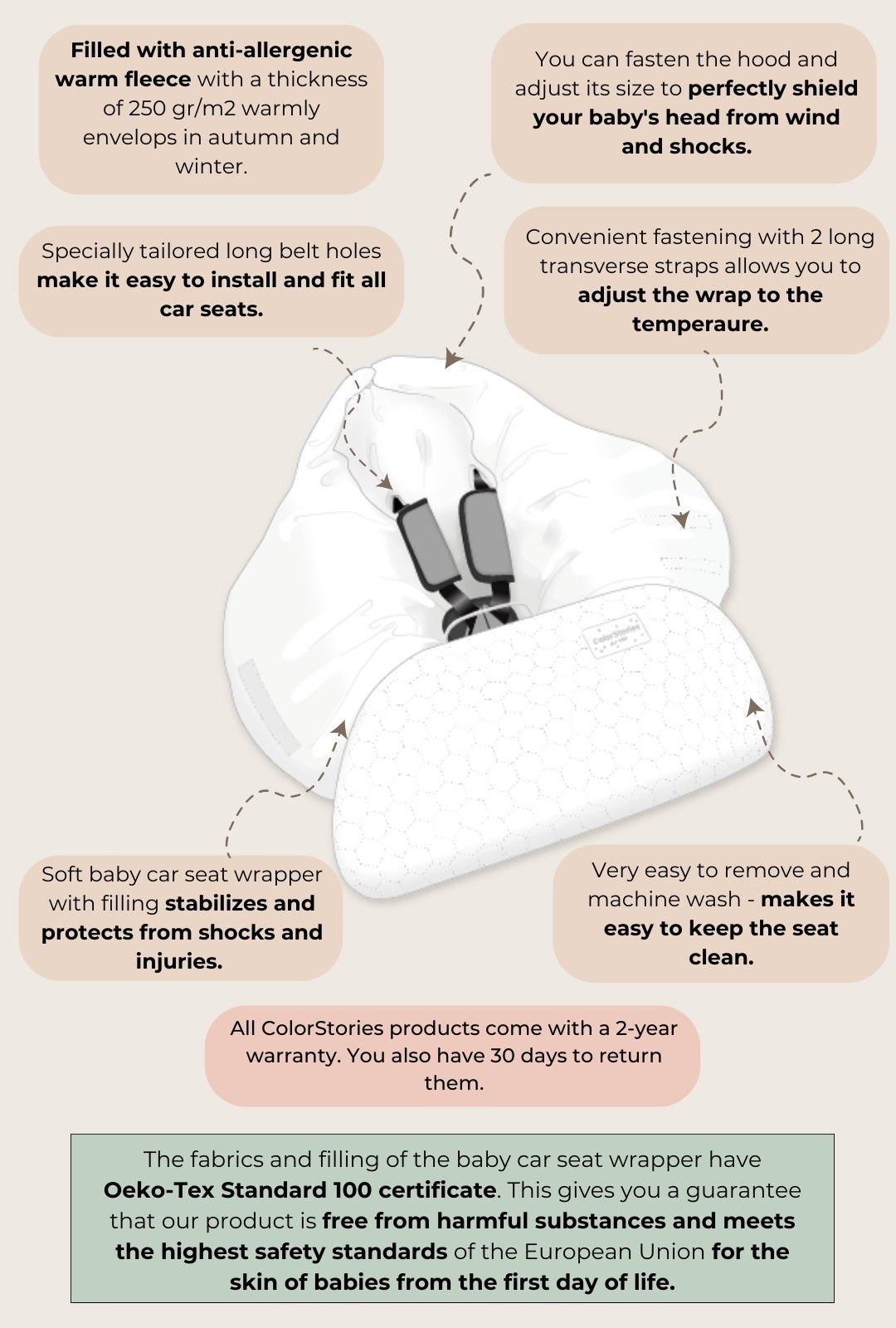 The ColorStories car seat cover for spring and summer is sewn from the highest quality, dense velvet cotton. The fabric, filling and accessories in our ColorStories car seat cover are certified with the Oeko-Tex Standard 100 safety certificate. This guarantees that our product is free of harmful substances and meets the highest safety standards of the European Union for babies from day one.