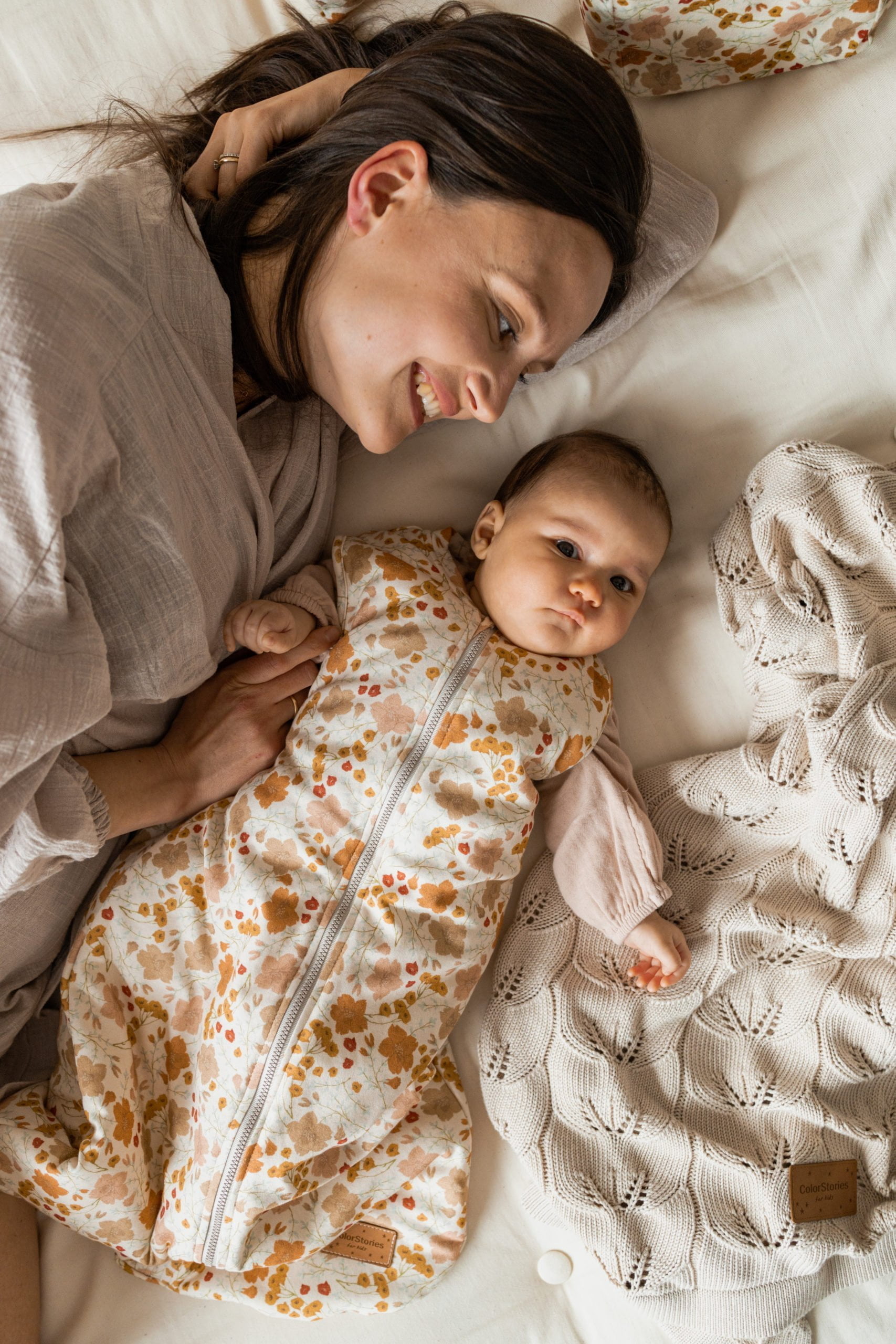 Our baby sleeping bag has been designed to provide your little one with not only warmth, but also complete freedom of movement. The downward-facing cut of the infant sleeping bag allows your little one to move their legs freely, which is essential for their healthy development. Thanks to the zip, which can be completely unzipped along its length or only partially unzipped from the bottom, the baby sleeping bag also makes it easier to change the baby at night without having to completely rouse the baby. Thanks to its natural stretchiness, the cotton we use to sew our sleeping bags is flexible, follows the baby’s movements and does not restrict his freedom of movement while sleeping.
