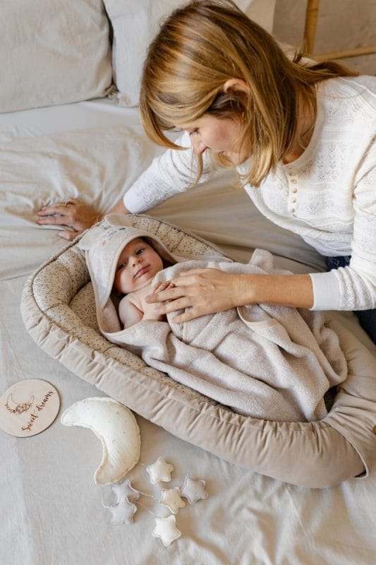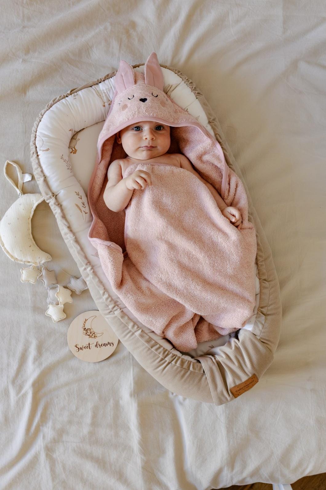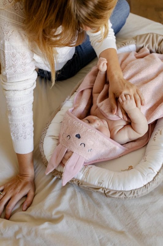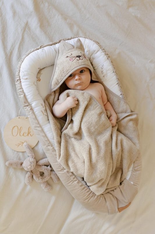 - Kocyk lub rożek – do otulenia dziecka po kąpieli, zapewniając mu poczucie bezpieczeństwa i komfortu.
