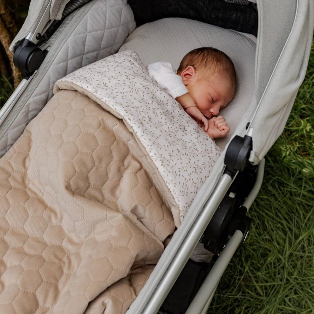 Skład: Warstwa I – tkanina minky pikowana, wzór w plaster miodu (100% poliester), warstwa II – tkanina 100% bawełna, wypełnienie – pikowanie ovata 100g + włóknina silikonowa 150g (100% poliester)