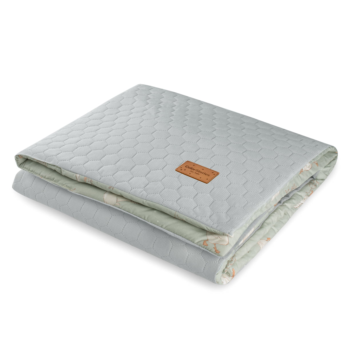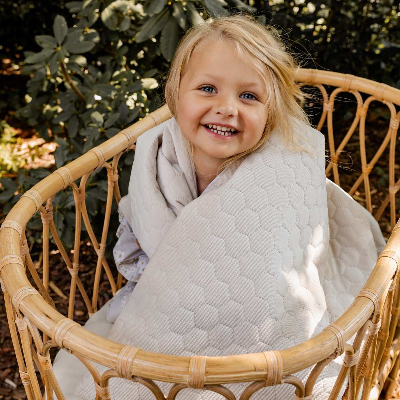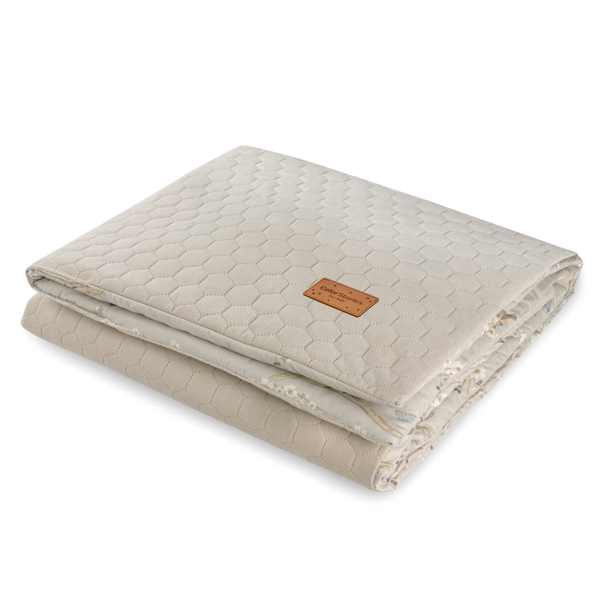 Skład: Warstwa I – tkanina minky pikowana, wzór w plaster miodu (100% poliester), warstwa II – tkanina 100% bawełna, wypełnienie – pikowanie ovata 100g + włóknina silikonowa 150g (100% poliester)