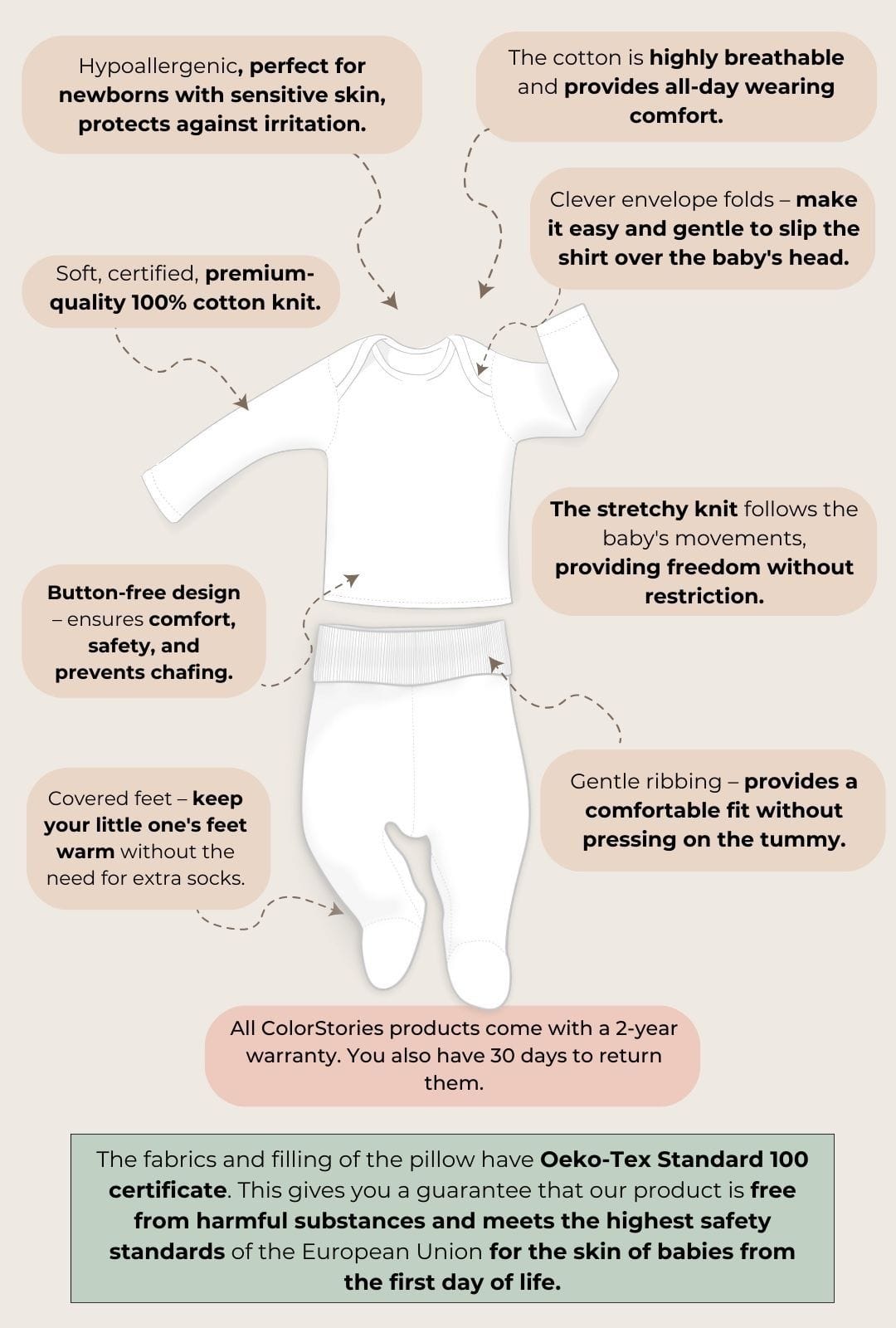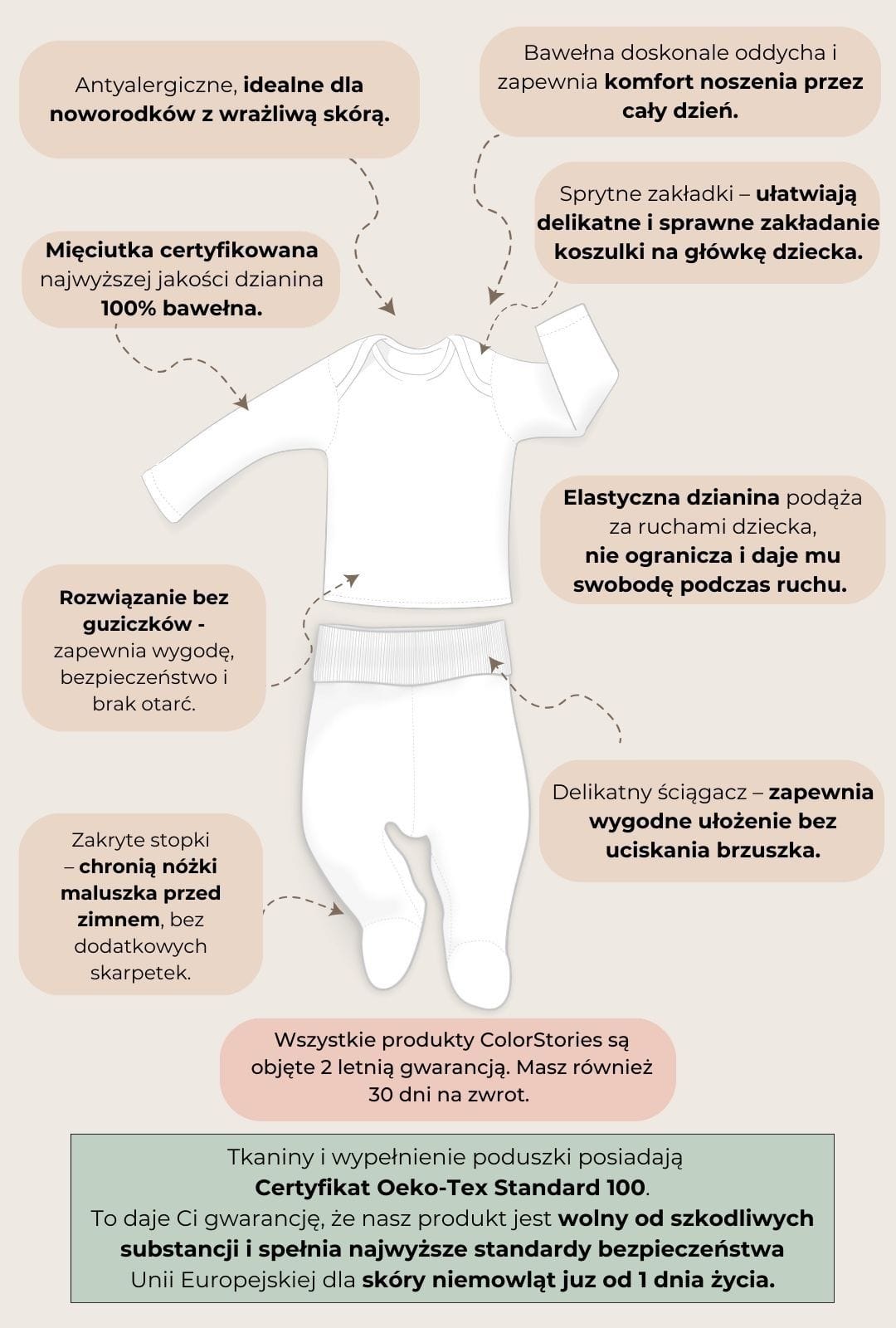 Wszystkie elementy naszego kompletu ubranek niemowlęcych są wykonane z najwyższej jakości, podwójnie czesanej bawełny 100%, która jest przyjazna dla delikatnej skóry dziecka i antyalergiczna. Naturalna bawełna doskonale oddycha, co zapewnia komfort noszenia przez cały dzień. To szczególnie ważne dla noworodków i niemowląt, które mają wrażliwą skórę i słabo rozwinięta termoregulację. Dzięki naturalnym właściwościom bawełny, ubranka ColorStories są również bardzo chłonne, miękkie, elastycznie podążąją za ruchami maluszka nie ograniczając ich i zapewniając zdrowy rozwój. To sprawia, że maluszek czuje się w nich swobodnie i bezpiecznie. Wybierając nasz komplet niemowlęcy, zapewniasz swojemu dziecku najlepszą ochronę i wygodę.