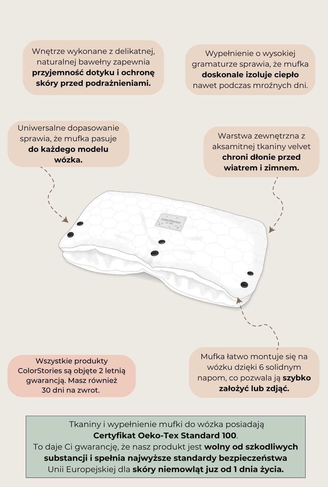 Spacery z Waszym Maleństwem to wyjątkowe chwile, pełne radości, odkryć i wspólnych przygód. Z myślą o Was i Waszych potrzebach stworzyliśmy mufkę do wózka dziecięcego ColorStories, która doskonale zadba o komfort Waszych rąk w chłodne dni jesienią i zimą.