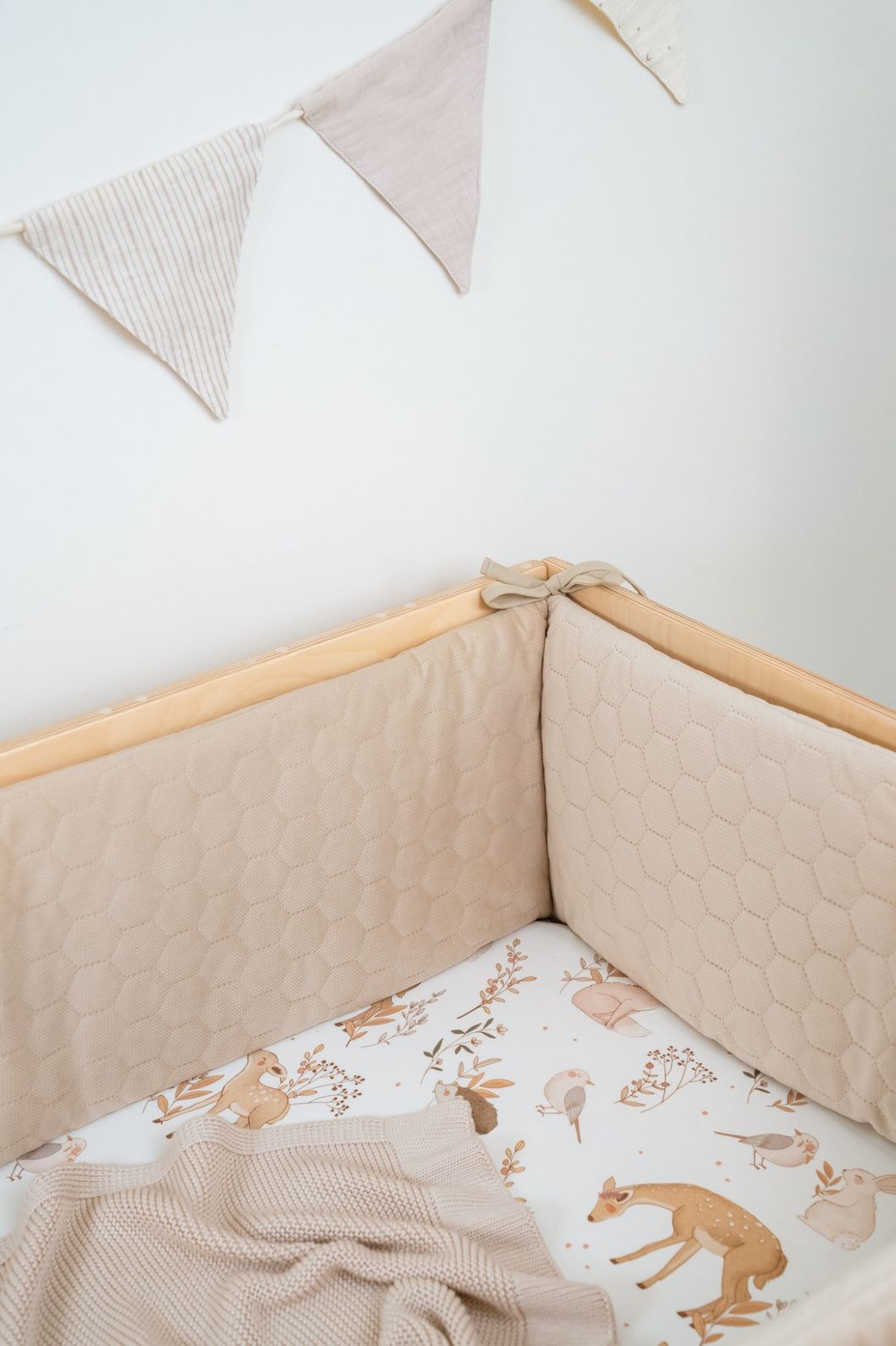 Ochraniacz do łóżeczka Velvet to miękka, ochronna bariera, która czule przejmuje Twoją rolę, gdy, choć na chwilę musisz odsunąć się od łóżeczka. To pewność, że każdy ruch, każde wiercenie się czy obrót, jest bezpieczny. To aksamitna miękkość, której dotyk koi, i subtelna elegancja, która zamienia zwykłe łóżeczko w przytulny azyl pełen ciepła.