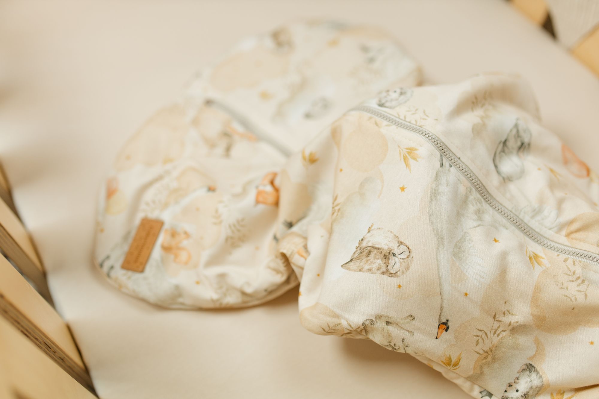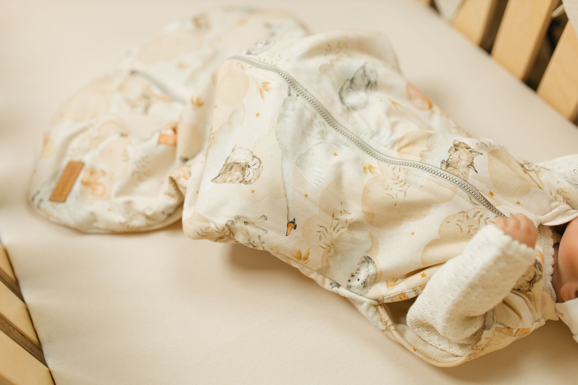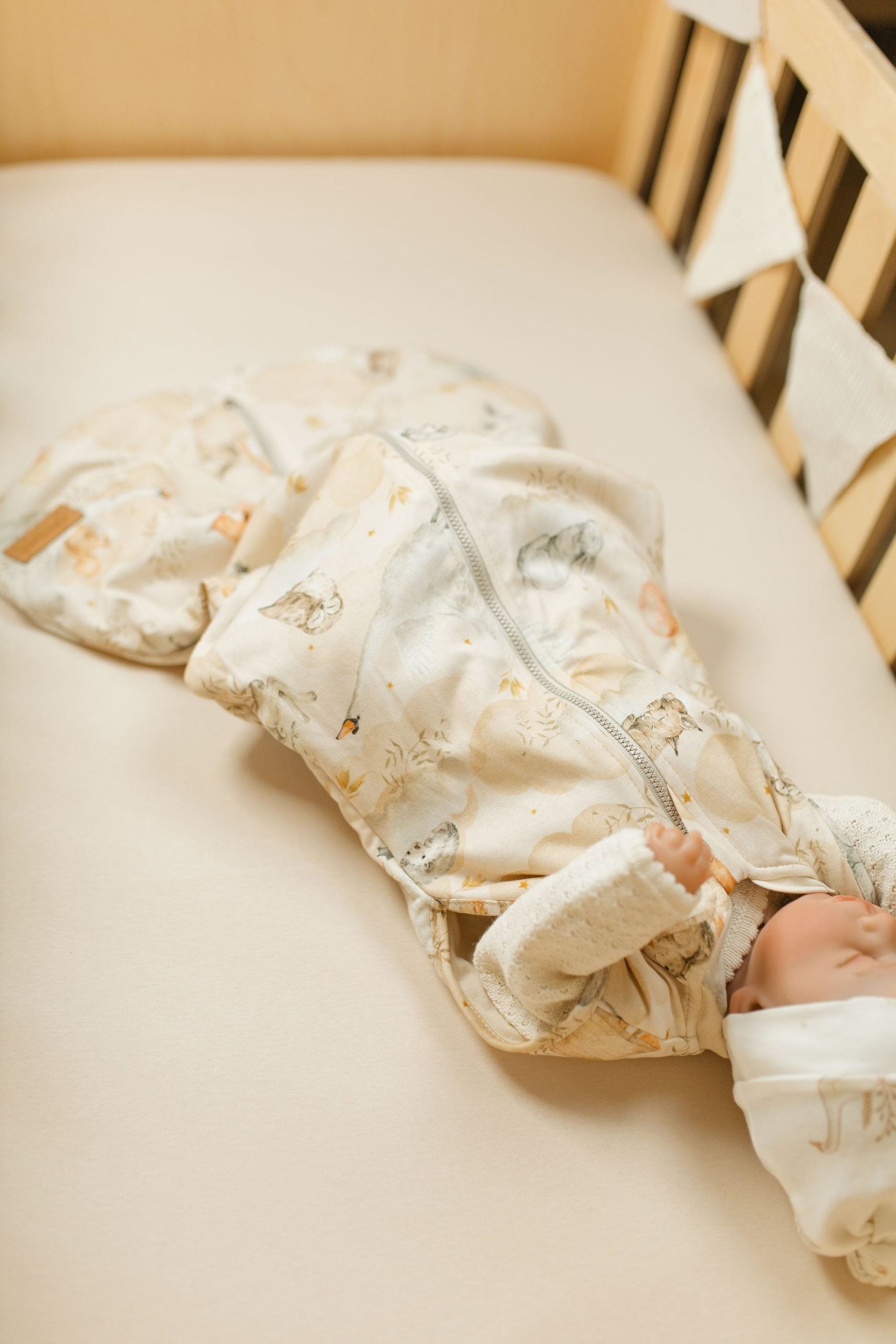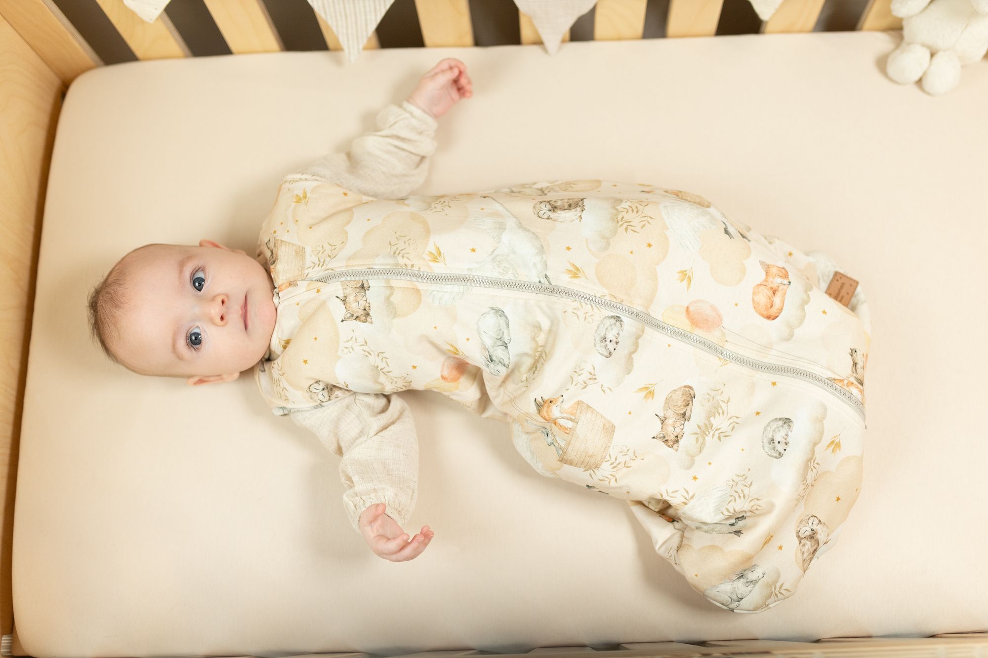 Dodatkowo listwa maskująca suwak od środka delikatnie chroni ciałko dziecka przed dotykiem zamka, a z zewnątrz zasłania go przy szyjce — dla pełnego bezpieczeństwa i estetycznego wyglądu śpiworka.