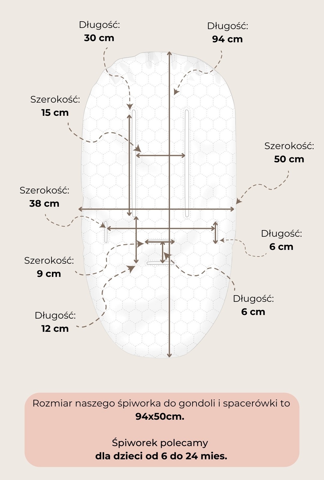 Śpiworek do gondoli i spacerówki został zaprojektowany tak, by towarzyszyć Wam od pierwszych dni aż do około 2. roku życia. Pasuje zarówno do gondoli, jak i do większości modeli spacerówek. Dzięki specjalnym otworom na pasy bezpieczeństwa i uniwersalnemu krojowi, łatwo go zamontować i dopasować – bez walki z zamkami, bez przekładania warstw.