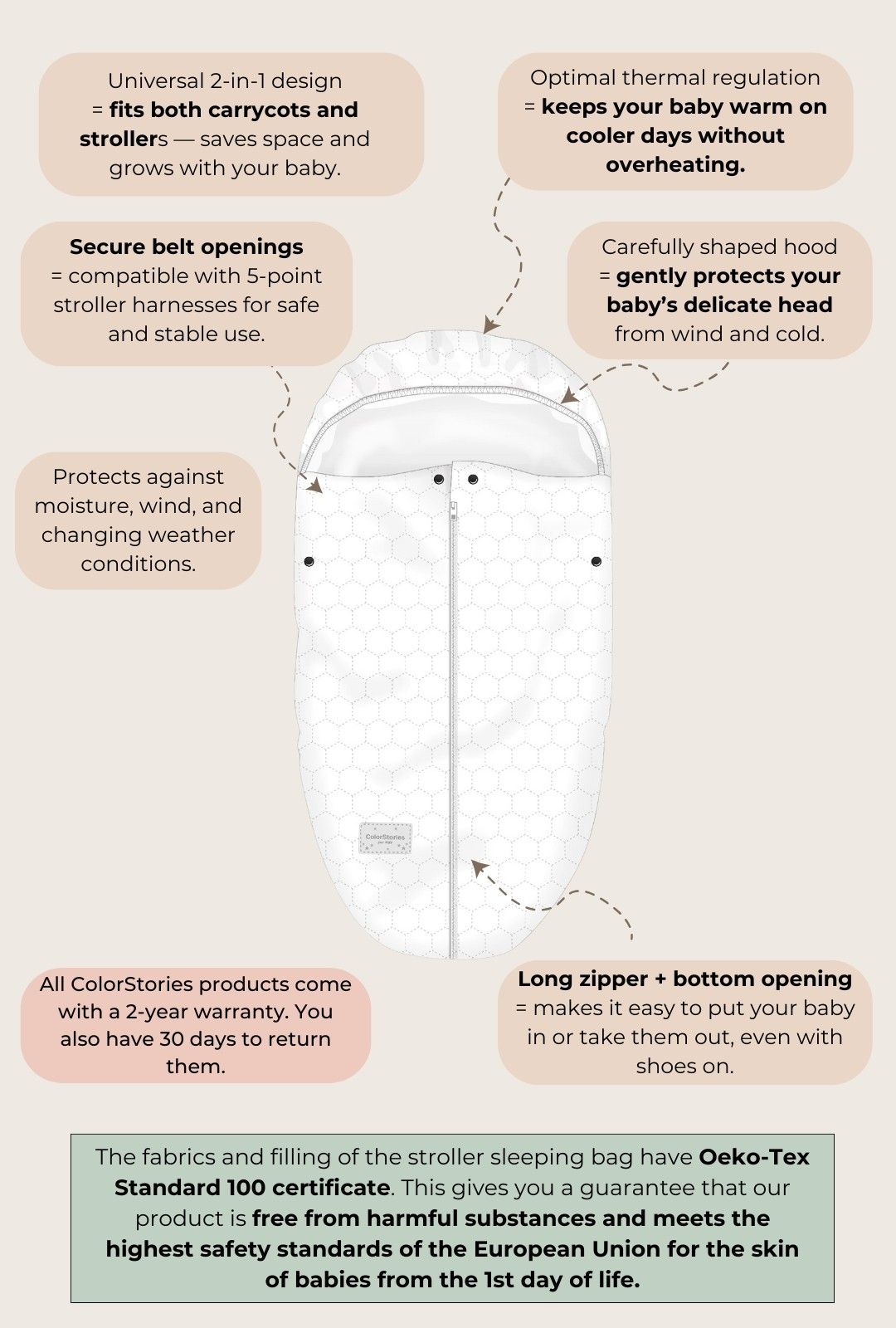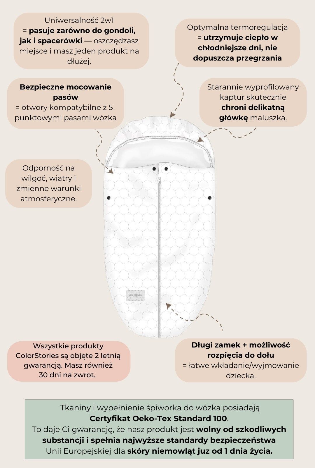 Śpiworek do spacerówki i gondoli od ColorStories to odpowiedź na te codzienne potrzeby. Uniwersalny, miękki i niezawodny, pasuje zarówno do gondoli, jak i do spacerówki. Sprawdzi się o poranku, podczas popołudniowej drzemki, na zimowym spacerze i w drodze do dziadków. Uszyty z najwyższej jakości materiałów, zachwyca detalami i precyzją wykonania. Subtelny, lekki i praktyczny – zawsze tam, gdzie go potrzebujesz. Bo komfort Maluszka to fundament każdego wspólnego wyjścia.