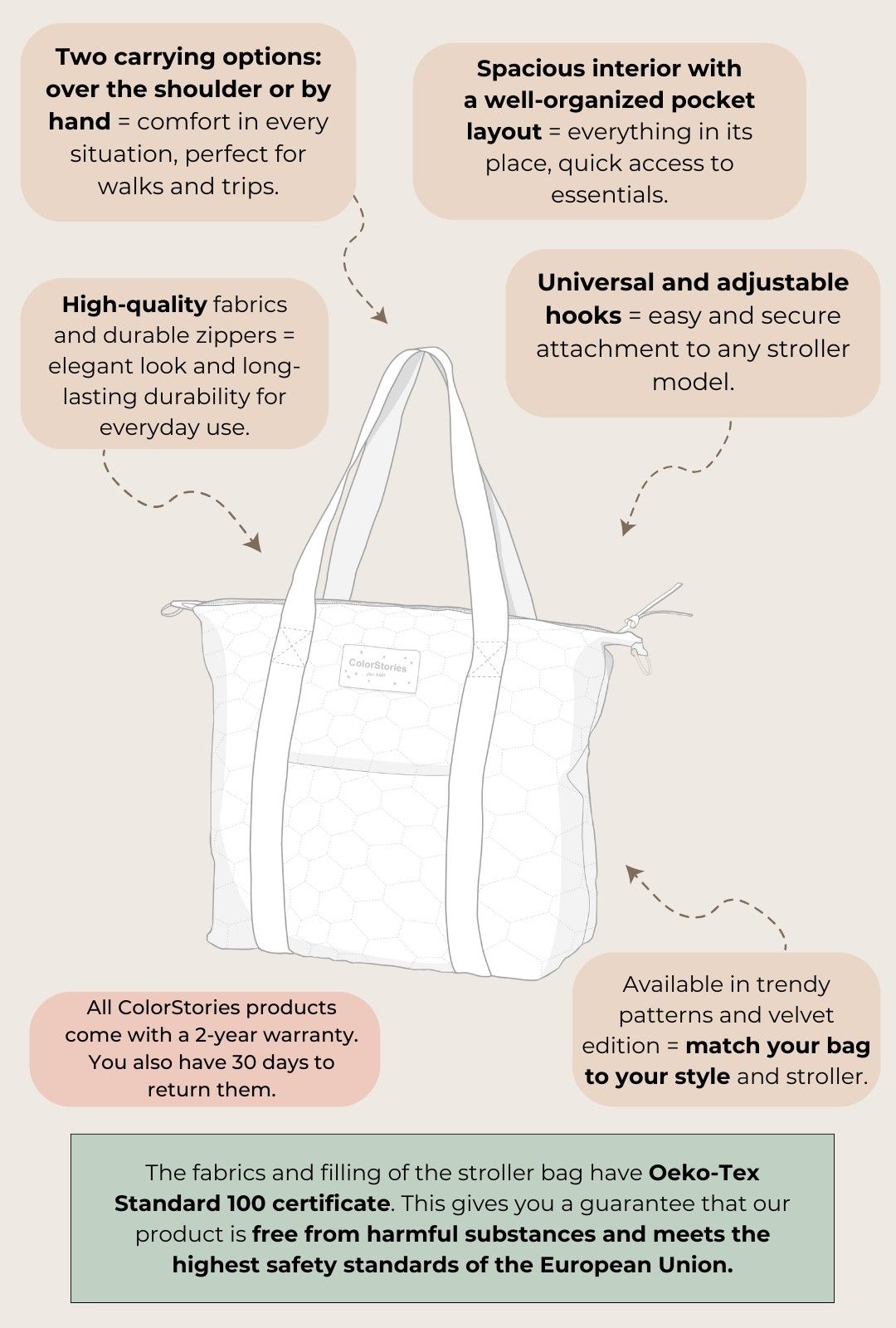 Torba dla mam powinna być nie tylko funkcjonalna, ale również trwała i łatwa w pielęgnacji. Dlatego każda torba do wózka ColorStories jest szyta w polskich szwalniach, z dbałością o najmniejszy detal. Precyzyjne przeszycia, solidne zamki i wytrzymałe uchwyty sprawiają, że produkt zachowuje swój kształt i elegancki wygląd nawet po długim użytkowaniu. Dostępne są dwa warianty – gładka torba z nadrukami z naszych najpiękniejszych i najpopularniejszych kolekcji oraz pikowana, jednokolorowa torba z tkaniny Velvet – zaprojektowane z myślą o różnych stylach i preferencjach.